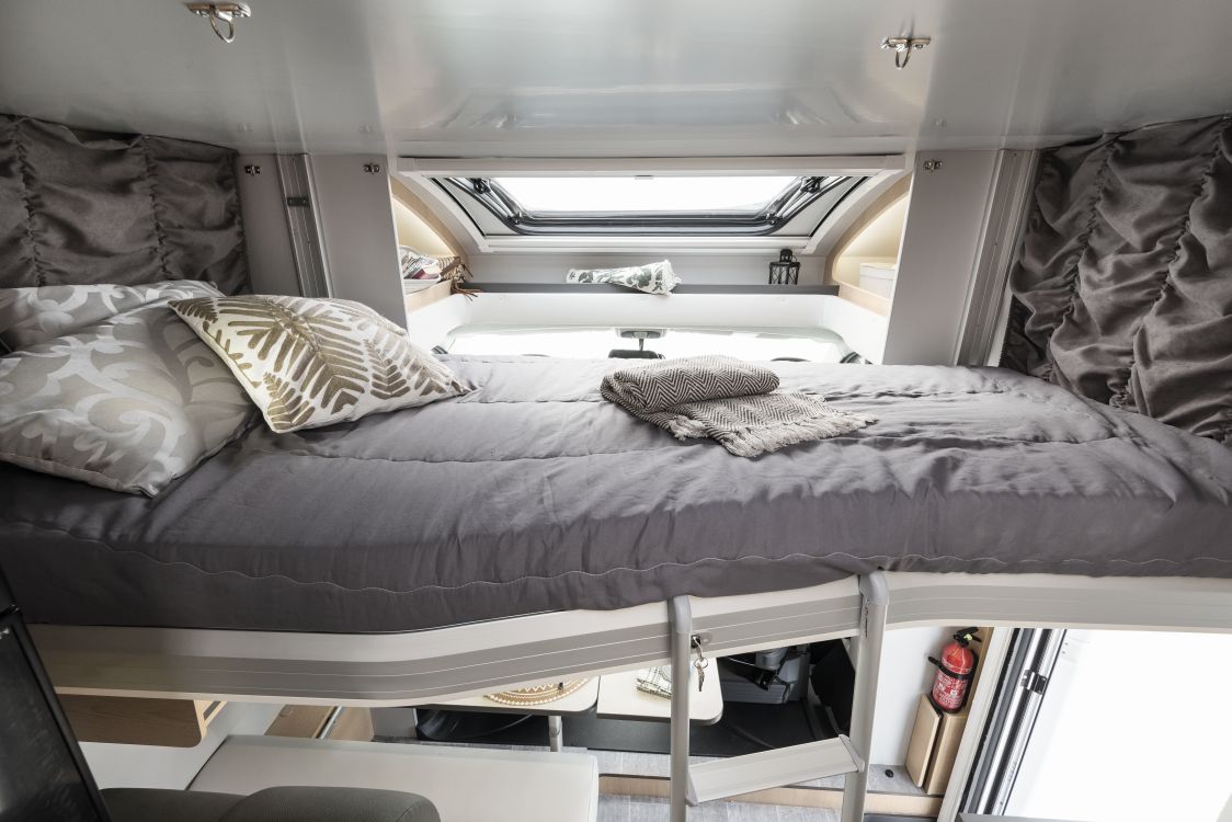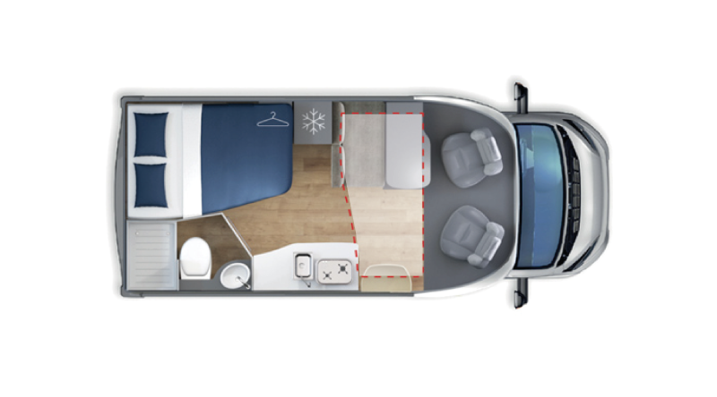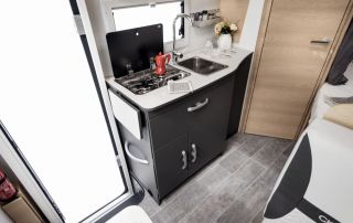 Herd & Spüle I Kühlschrank 12 V, 220 V, Gas I Klimaanlage im Fahrerhaus I Heizung mit Umluft I Toilette & Dusche I Warmwasserboiler I Frisch- & Abwassertank I Zusatzbatterie mit Ladegerät I Thermomatten für Fahrerhaus I Wasserschlauch I Anschlusskabel I Fahrradträger*