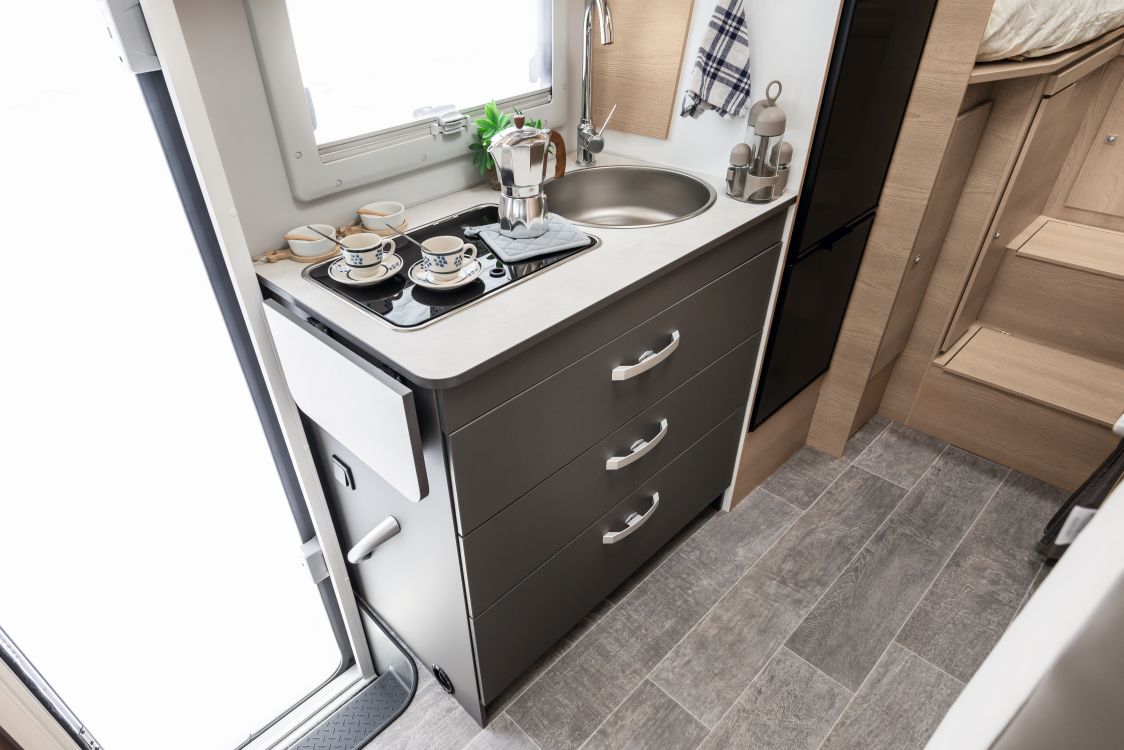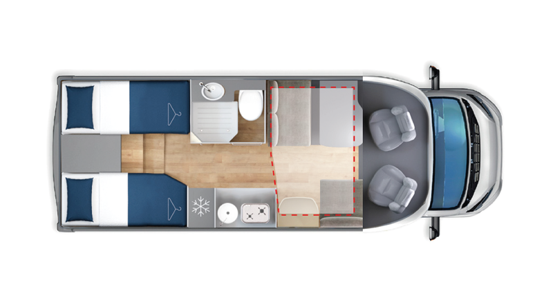 Herd & Spüle I Kühlschrank 12 V, 220 V, Gas I Klimaanlage im Fahrerhaus I Heizung mit Umluft I Toilette & Dusche I Warmwasserboiler I Frisch- & Abwassertank I Zusatzbatterie mit Ladegerät I Thermomatten für Fahrerhaus I Wasserschlauch I Anschlusskabel I Fahrradträger*