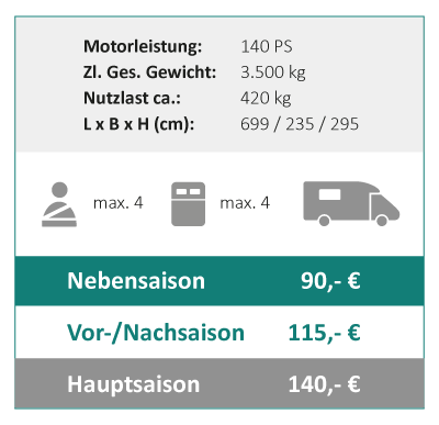 *Bei allen Kompakt-/ Kastenwagen ist eine Anhängerkupplung verbaut, für die ein Fahrradträger für 5,00 € pro Tag gemietet werden kann. Sofern Sie einen eigenen Fahrradträger für die AHK haben, kann dieser natürlich kostenfrei genutzt werden.