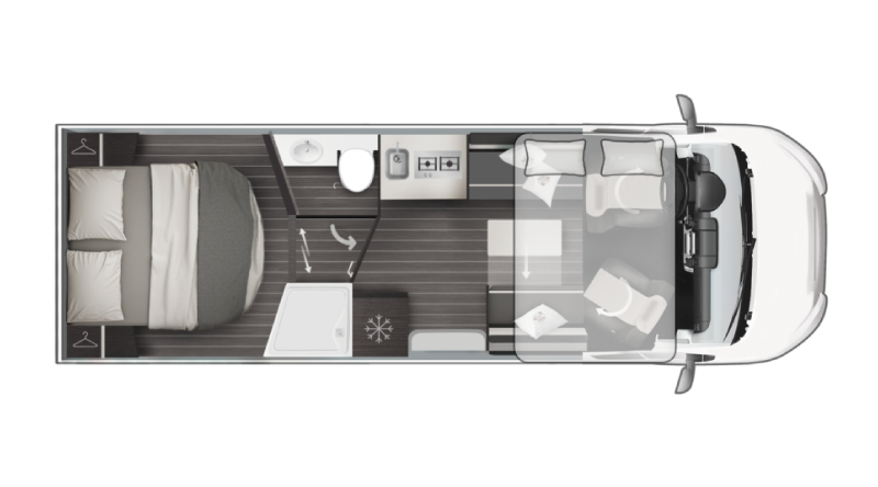 Herd & Spüle I Kühlschrank 12 V, 220 V, Gas I Klimaanlage im Fahrerhaus I Heizung mit Umluft I Toilette & Dusche I Warmwasserboiler I Frisch- & Abwassertank I Zusatzbatterie mit Ladegerät I Thermomatten für Fahrerhaus I Wasserschlauch I Anschlusskabel I Fahrradträger*
